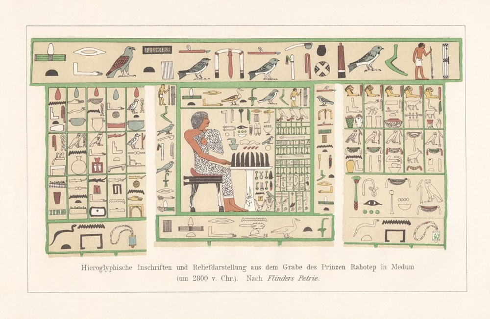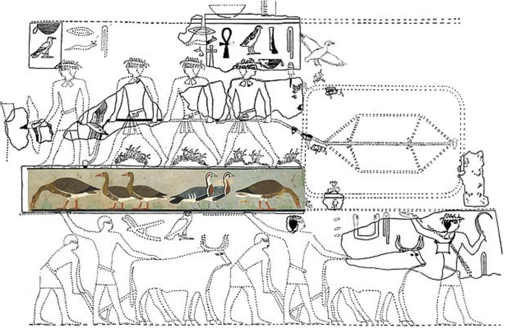 Bununla birlikte tabloda su kuşunun diğer iki cinsi de yer alıyor. Figürlerin iki üçlü halinde tasvir edildiği görülüyor. Eski Mısır ikonografisindeki üçlü desenler çoğulları temsil ediyor.