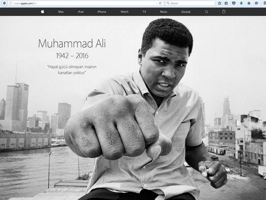 Apple tüm zamanların en iyi boksörü olarak gösterilen Muhammed Ali'ye vefasını gösterdi. Teknoloji devi, başarılarla dolu bir yaşamın yanında ırkçılığa karşı verdiği mücadeleyle de dünya siyasi tarihinde önemli bir figüran olan Muhammed Ali için Apple anasayfasını güncelledi.