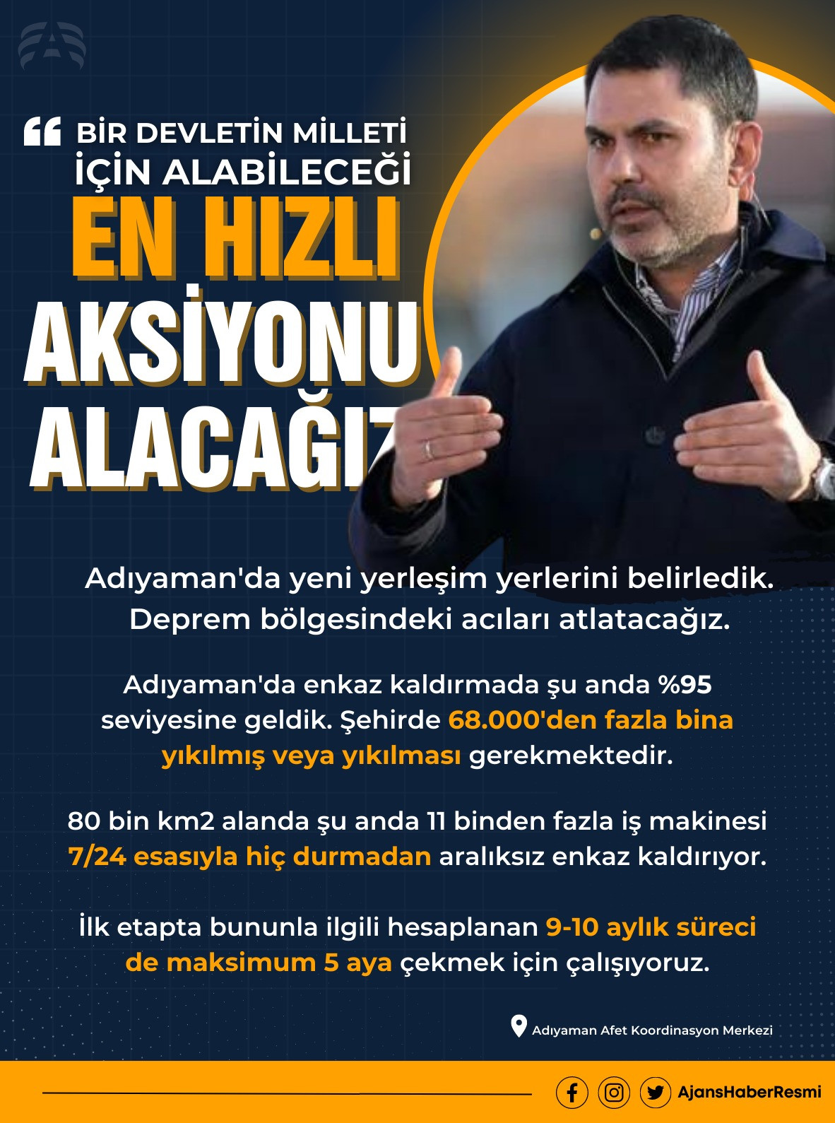 Devletimiz, Cumhurbaşkanımızın liderliğinde var gücü ile çalışmaktadır. Son ana kadar çalışacağız. Adıyaman ve 10 ilimizi güzelleştirmek için çalışmalarımızı sürdüreceğiz. Acıları dindirebilmek için çalışmalarımızı sürdürüyoruz. Enkaz kaldırma, çadır kurma, konteyner kentlerin kurulması çalışmalarını koordinasyon çerçevesinde gerçekleştirme gayretindeyiz.