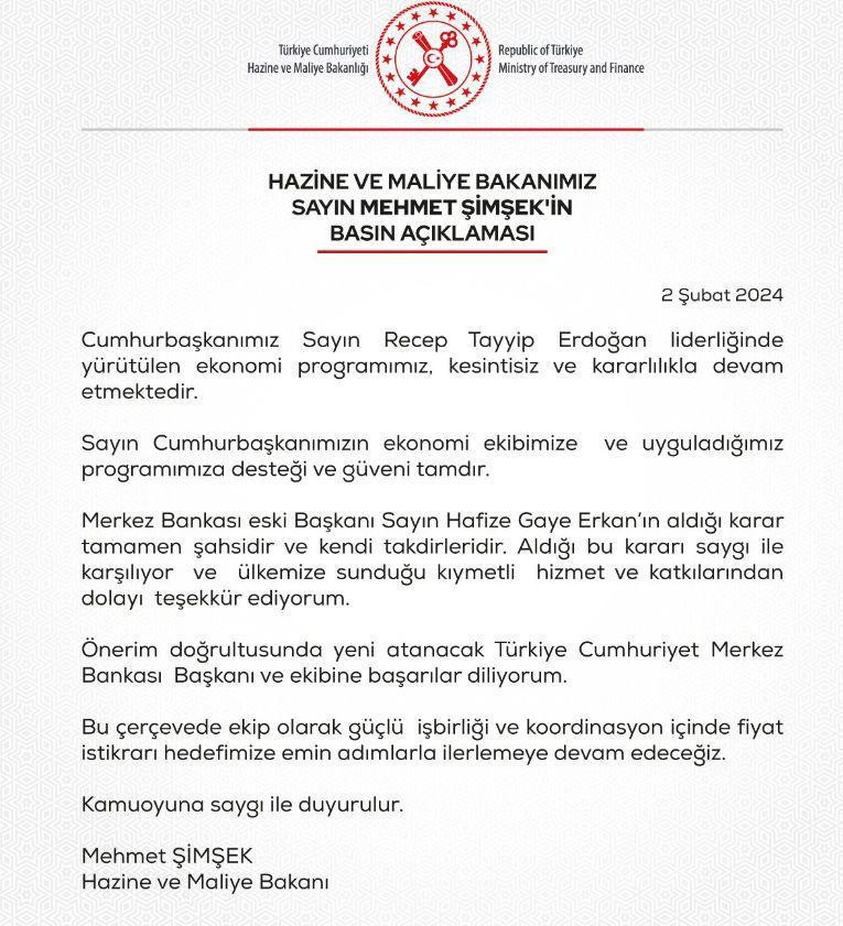 Hazine ve Maliye Bakanı Mehmet Şimşek, TCMB Başkanı Erkan'ın istifası sonrası "Ekonomi programımız, kesintisiz ve kararlılıkla devam etmekte" ifadelerini kullandı.