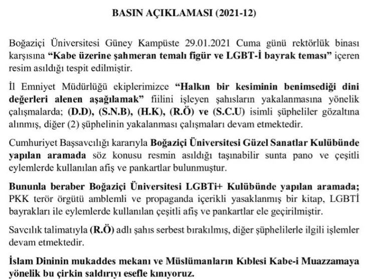 Cumhuriyet Başsavcılığı kararıyla Boğaziçi Üniversitesi Güzel Sanatlar Kulübünde yapılan aramada, söz konusu resmin asıldığı taşınabilir sunta pano ve çeşitli eylemlerde kullanılan afiş ve pankartlar bulunduğu kaydedilen açıklamada, "Bununla beraber Boğaziçi Üniversitesi LGBTi+ Kulübünde yapılan aramada; PKK terör örgütü amblemli ve propaganda içerikli yasaklanmış bir kitap, LGBTİ bayrakları ile eylemlerde kullanılan çeşitli afiş ve pankartlar ele geçirilmiştir. Savcılık talimatıyla (R.Ö) adlı şahıs serbest bırakılmış, diğer şüphelilerle ilgili işlemler devam etmektedir." bilgisi verildi.
