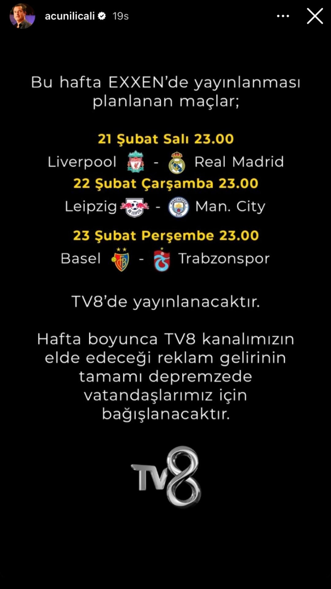 TV8'in ve Acun Medya'nın sahibi Acun Ilıcalı, bu hafta EXXEN'de yayınlanması planlanan Liverpool-Real Madrid, RB Leipzig-Manchester City ve Basel-Trabzonspor maçlarını TV8'in yayınlayacağını açıkladı.
