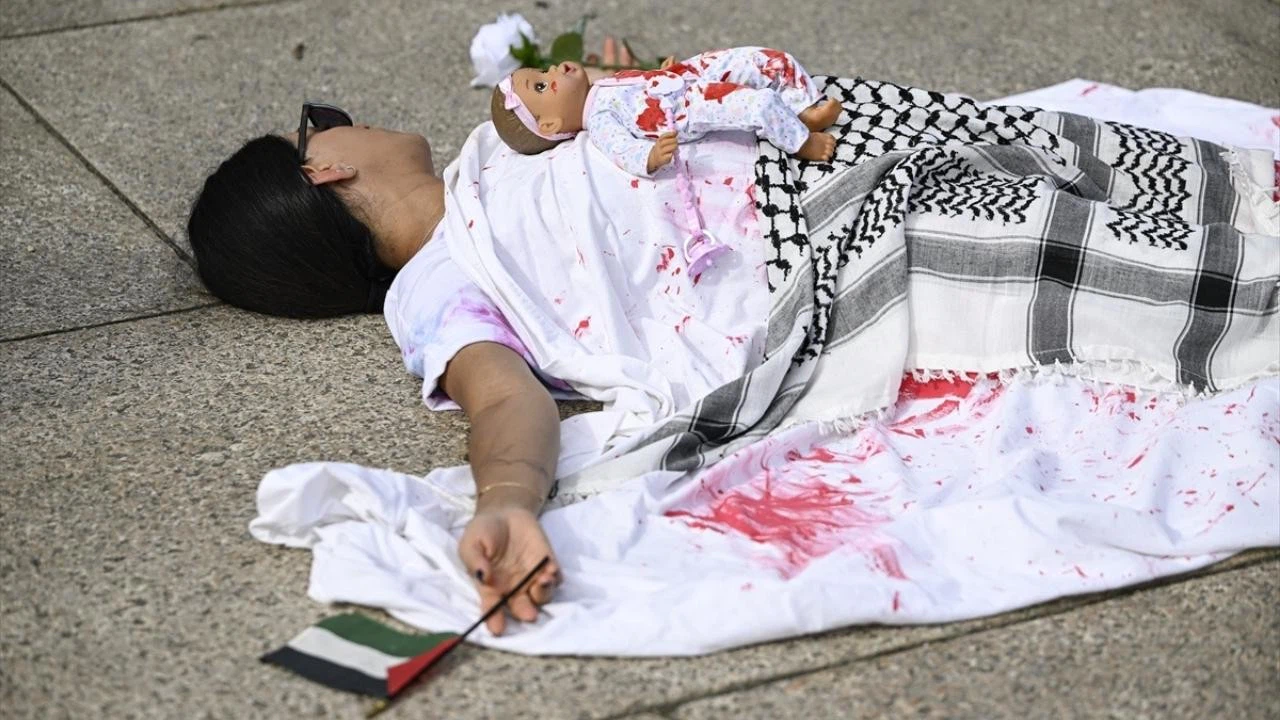 Aktivistler, Gazze'deki saldırılarda hayatını kaybeden sivilleri ve çocukları temsilen, yere uzanıp üzerlerine Filistin bayrağı örttü.