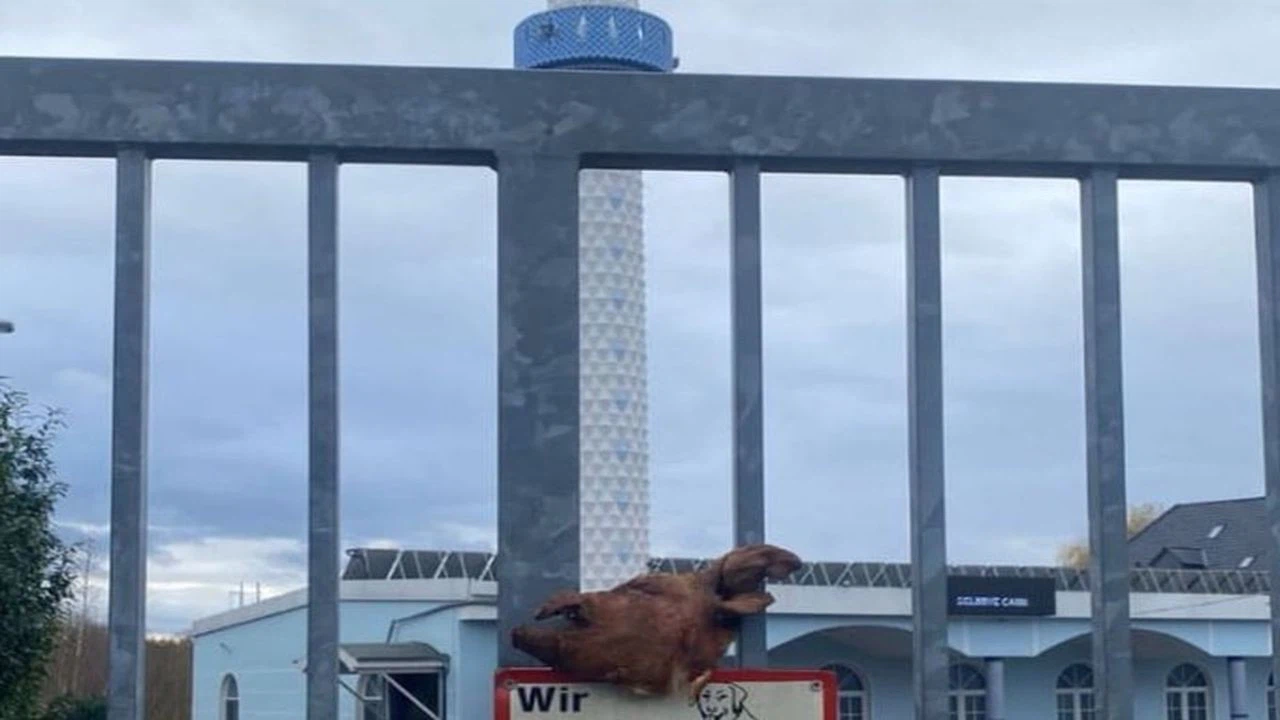 Güvenlik kamerasında, sabaha karşı 04.32'de kimliği belirsiz bir kişinin caminin kapısına gelerek domuz başı astığı ve başla fotoğraf çekildiği görülüyor.
