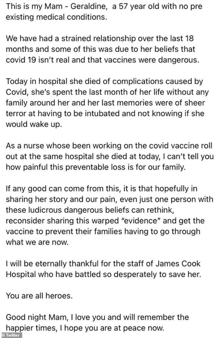 Amy Crosby sosyal medya hesaplarından paylaştığı gönderide aşı karşıtı annesinin önceden hiçbir sağlık sorununa sahip olmayan sağlıklı bir yetişkin olduğunu söylerken aralarının annesinin virüse inanmaması ve aşı karşıtlığı yüzünden son bir buçuk senedir bozuk olduğunu da belirtti.