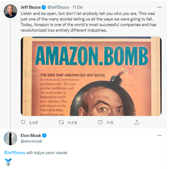 Musk, 11 Ekim'de Bezos'un attığı bir tweet'e ikincilik madalyası emojisi gönderdi.