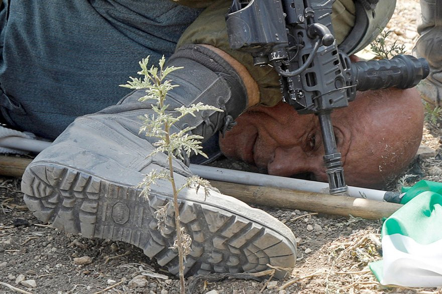 Çekilen görüntülerde George Floyd’a uygulanan şiddetin bir benzerinin yapıldığı görülüyor. Çevik kuvvet birimlerine bağlı olduğu tahmin edilen bir İsrail askeri yaşlı bir adamı yüzüstü yere yatırıp kelepçelerken özel korumalı dizliğiyle çaresiz adamın boğazını sıkıyor.