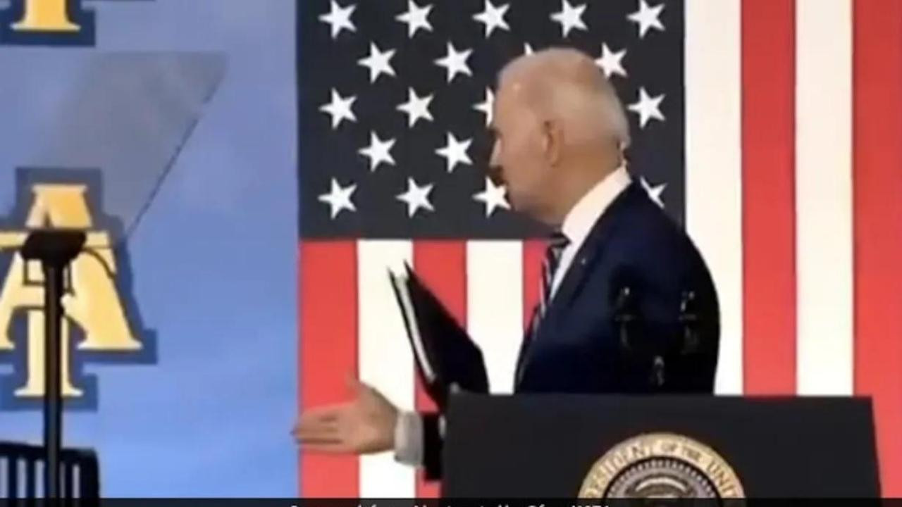 Konuşmasını bitirdikten sonra karşısında kimse olmamasına rağmen boşluk ile tokalaşan Biden daha sonra hiçbir şey söylemeden sahneden ayrıldı.