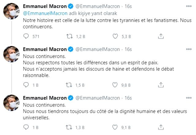 Macron Paylaşımında, "Asla pes etmeyeceğiz. Barış ruhu içinde tüm farklılıklara saygı duyuyoruz. Nefret söylemini kabul etmiyoruz ve mantıklı tartışmaları savunuyoruz. Her zaman insan onurunun ve evrensel değerlerin tarafında olacağız" ifadelerini kullandı.