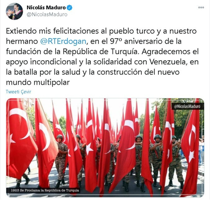 Venezuela Devlet Başkanı Nicolas Maduro sosyal medya hesabı üzerinden yaptığı paylaşımda, "Türkiye Cumhuriyeti’nin kuruluşunun 97’nci yıl dönümünde Türk halkına ve kardeşimiz Recep Tayyip Erdoğan’a tebriklerimi sunuyorum. Venezuela’ya sağlık mücadelesinde ve yeni çok kutuplu dünyanın inşasında koşulsuz destek ve dayanışması için teşekkürlerimi sunuyorum” ifadelerini kullandı.