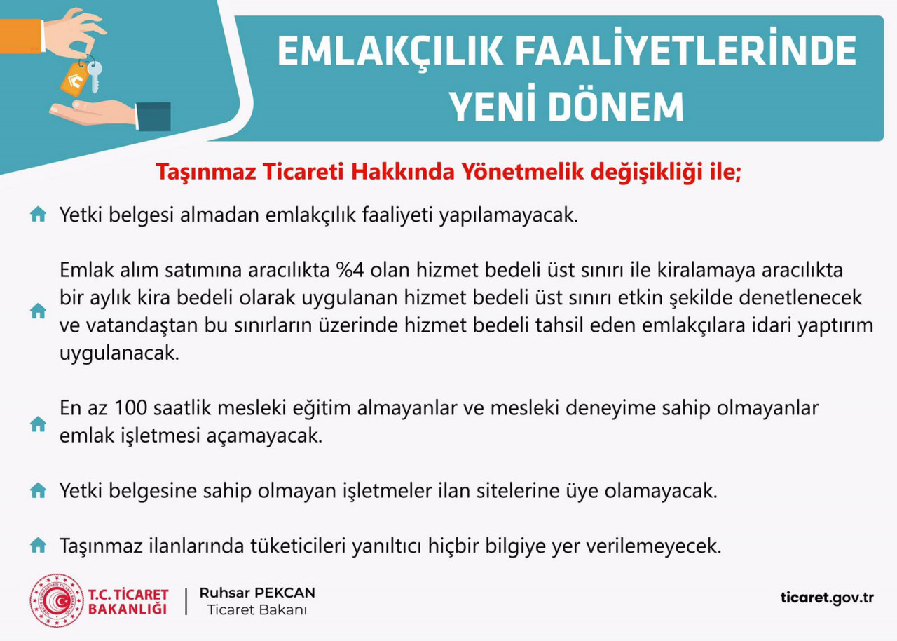 Ticaret Bakanı Ruhsar Pekcan, "Yetki belgesi almadan emlakçılık yapılamayacak, belgesi olmayan işletmeler ilan sitelerine üye olamayacak." dedi. Pekcan söz konusu değişiklik ile emlakçılık faaliyetlerinde hizmet kalitesinin artırılmasını, haksız rekabetin ortadan kaldırılmasını ve kayıt dışılığın önlenmesini amaçladıklarını belirtti.