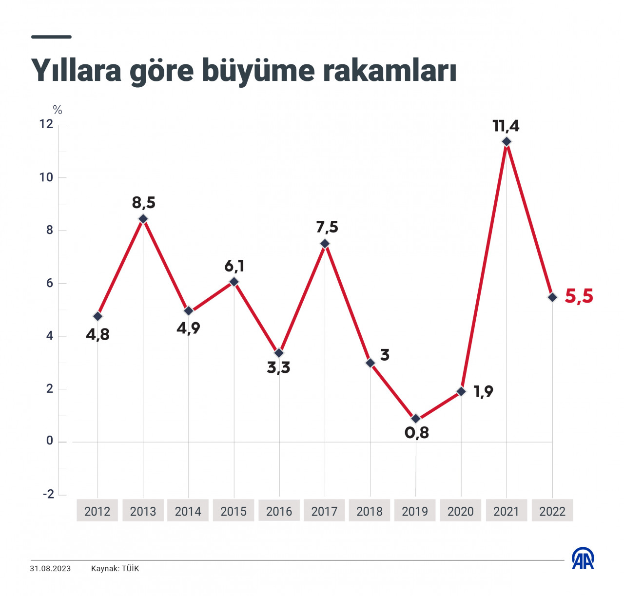 TÜİK tarafından bugün açıklanan Gayri Safi Yurtiçi Hasıla (GSYH) verilerine göre, Türkiye ekonomisi, 2023 yılının ikinci çeyreğinde geçen yılın aynı dönemine göre yüzde 3,8 büyüdü.