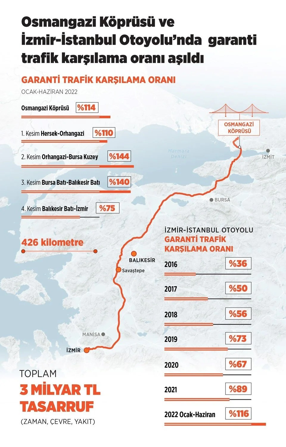 Ulaştırma ve Altyapı Bakanı Adil Karaismailoğlu konuyla ilgili yaptığı paylaşımda, “İzmir-İstanbul Otoyolu ve Osmangazi Köprüsü ile yıllık 3 milyar TL tasarruf sağlıyoruz” dedi.