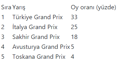 Yarışseverler, Lewis Hamilton'ın kazanarak şampiyonluğunu ilan ettiği Türkiye Grand Prix'sini yüzde 33 oyla birinci seçti.