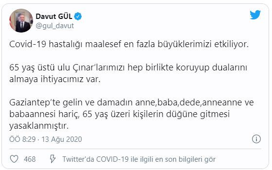 "65 yaş üstü ulu çınarlarımızı hep birlikte koruyup dualarını almaya ihtiyacımız var. Gaziantep'te gelin ve damadın anne, baba, dede, anneanne ve babaannesi hariç 65 yaş üstü kişilerin düğüne gitmesi yasaklanmıştır."
