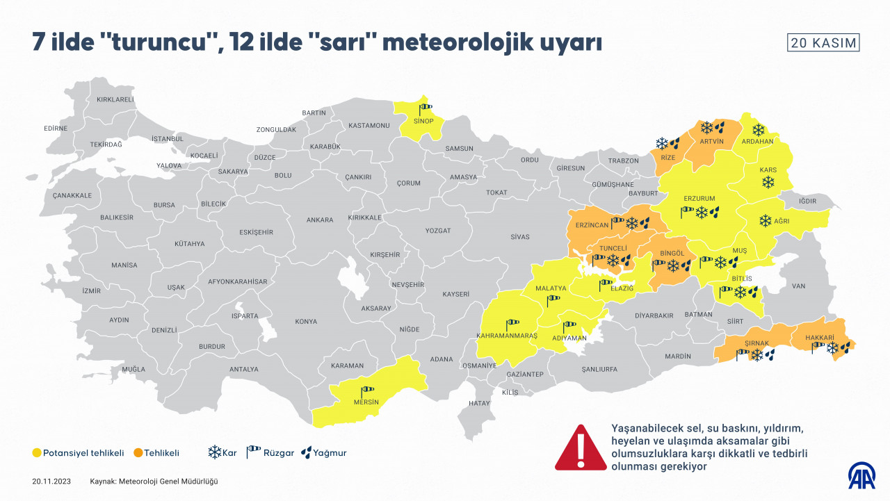 Yağışların; Batı Karadeniz kıyıları, Doğu Karadeniz, Doğu Anadolu’nun doğusu, Güneydoğu Anadolu'nun doğusu ile Ordu ve Düzce çevrelerinde kuvvetli, Doğu Karadeniz'in doğusu, Doğu Anadolu'nun güneydoğusu ile Batman ve Siirt çevrelerinde yer yer çok kuvvetli ve şiddetli olması beklendiğinden yaşanabilecek ani sel, yerel su baskını, taşkın gibi olumsuzluklara karşı dikkatli ve tedbirli olunması gerekmektedir.