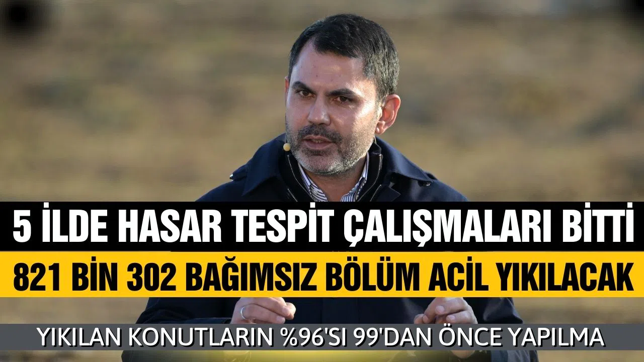 Bakan Kurum, 5 ilimizde hasar tespit çalışmalarını tamamlandığını belirtti. Kalan illerde de hasar tespit çalışmasında %90 seviyesine gelindiğini bildirdi. Kurum, artçı depremler nedeniyle yeniden hasar tespiti çalışılan yerlerin olduğunu ekledi. Bakan Kurum, yıkılan binaların %96.6'sının 99 öncesi yapıldığını ifade etti.