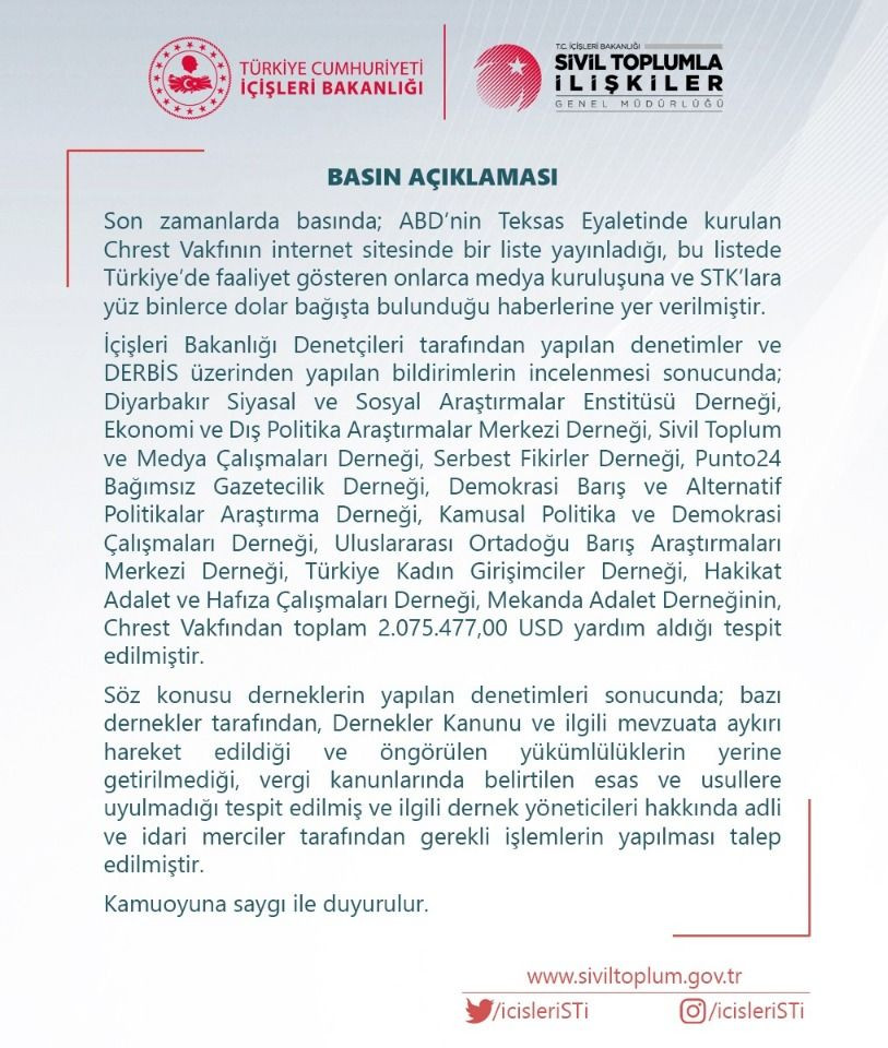 ABD merkezli Chrest Foundation Vakfı, Türkiye'de fonladığı medya kuruluşunun listesini yayımladı. On binlerce dolar hibe alan kuruluşlar arasında Serbest Fikirler Derneği, Bağımsız Gazetecilik Derneği, Uluslararası Ortadoğu Barış Araştırmaları Merkezi Derneği bulunuyor. İçişleri Bakanlığı Sivil Toplumla İlişkiler Genel Müdürlüğü'nden, Cherst Vakfı tarafından Türkiye’de faaliyet gösteren STK’lara bağışta bulunulduğu haberlerine ilişkin basın açıklaması yapıldı.