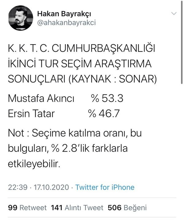 "KKTC seçimlerinde yüzde 53 olarak tahmin ettiğimiz M. Akıncı yüzde 48 civarı oy almış gibi görünmektedir. Lefkoşa'da ve Girne'de Akıncı 53 civarı oy almasına rağmen Magosa'daki Tatar üstünlüğü sonucu belirlemiştir. Ayrıca seçimlere müdahale edildiği iddiası vardır. Hayırlısı olsun."