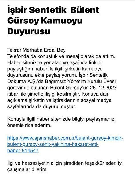 "İşbir Sentetik Dokuma A.Ş.’de Bağımsız Yönetim Kurulu Üyelerinden biri olan Bülent Gürsoy’un dün akşam KAP’ta yapılan açıklama ile birlikte şirketimizle olan ilişkisinin kesildiğini kamuoyuna duyururuz."