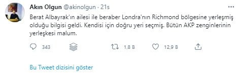 Akın Olgun, sosyal paylaşım sitesi Twitter'daki şahsi hesabında; "Berat Albayrak'ın ailesi ile beraber Londra'nın Richmond bölgesine yerleşmiş olduğu bilgisi geldi. Kendisi için doğru yeri seçmiş. Bütün AKP zenginlerinin yerleşkesi malum.." iddiasında bulunmuştu.