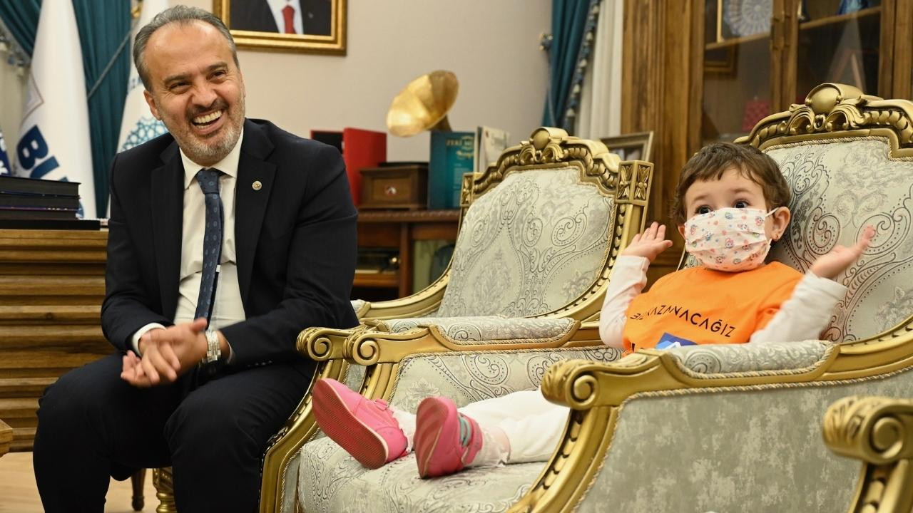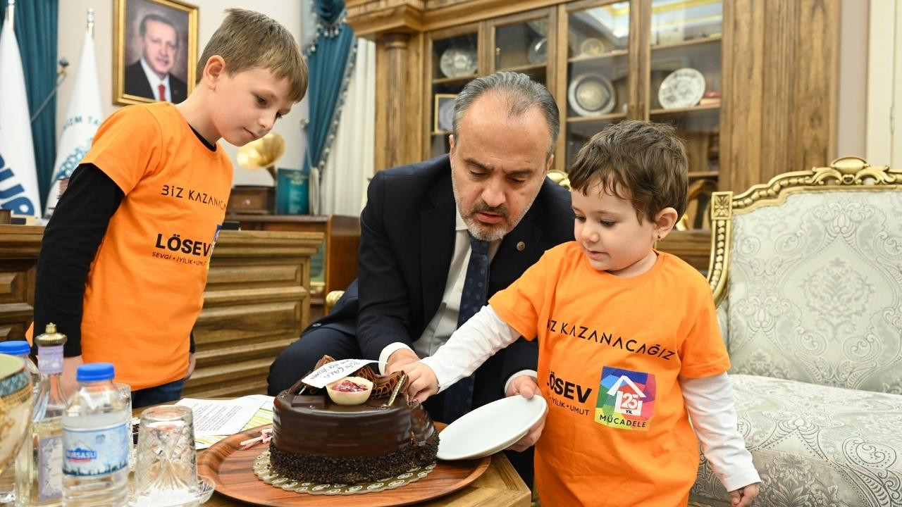 Hafta etkinlikleri çerçevesinde Bursa LÖSEV İl Koordinatör Yardımcısı Aslı Sakarya, beraberindeki hastalıkla mücadele eden 3 küçük kahramanla birlikte Büyükşehir Belediye Başkanı Alinur Aktaş’ı makamında ziyaret etti. Küçük kahramanlarla sohbet eden Başkan Aktaş, onlara çeşitli hediyeler verip, birlikte pasta kesti.