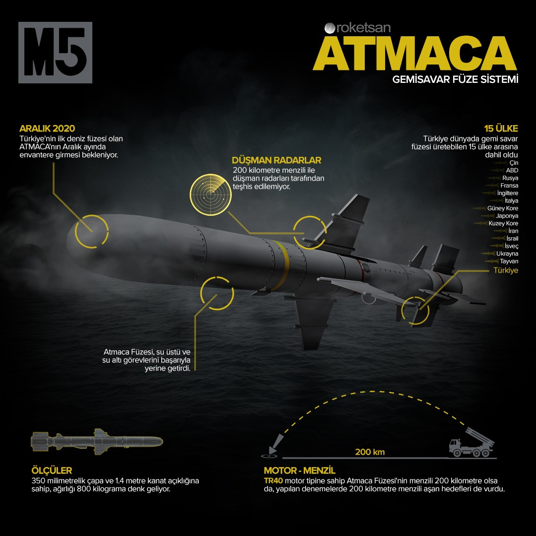 Daha önceden yurt dışından alınan füzelerin yerini alacak olan Atmaca füzesi Türk Deniz Kuvvetleri'nin ihtiyaçlarını karşılamak için yerli ve milli imkanlarla geliştirildi. 250 kilometre menzile sahip olan Atmaca denizin üzerine çok yakın seviyede uçabiliyor.