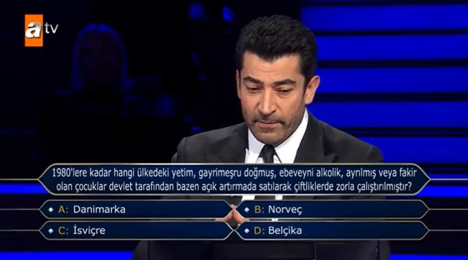 Yarışmacıya yöneltilen, "1980’lere kadar hangi ülkedeki yetim, gayrimeşru doğmuş, ebeveyni alkolik, ayrılmış veya fakir olan çocuklar devlet tarafından bazen açık artırmada satılarak çiftliklerde zorla çalıştırılmıştır?" sorusu izleyicilerde büyük bir şaşkınlık yarattı.