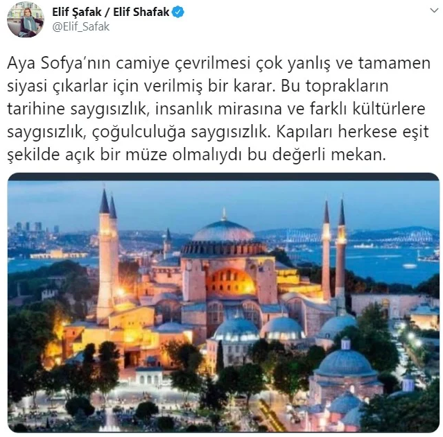 Elif Şafak, "Ayasofya'nın camiye çevrilmesi çok yanlış ve tamamen