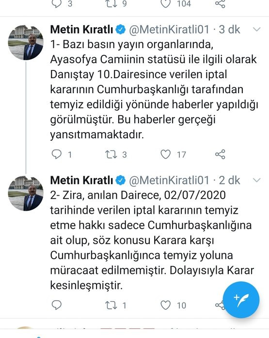 İletişim Başkanlığı, "Ayasofya Camii'nin statüsü ile ilgili olarak Danıştay 10. Dairesince verilen iptal kararının Cumhurbaşkanlığı tarafından temyiz edildiği" yönündeki haberlerin gerçeği yansıtmadığını bildirdi.