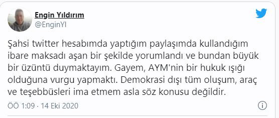Şahsi twitter hesabımda yaptığım paylaşımda kullandığım ibare maksadı aşan bir şekilde yorumlandı ve bundan büyük bir üzüntü duymaktayım. Gayem, AYM'nin bir hukuk ışığı olduğuna vurgu yapmaktı. Demokrasi dışı tüm oluşum, araç ve teşebbüsleri ima etmem asla söz konusu değildir.