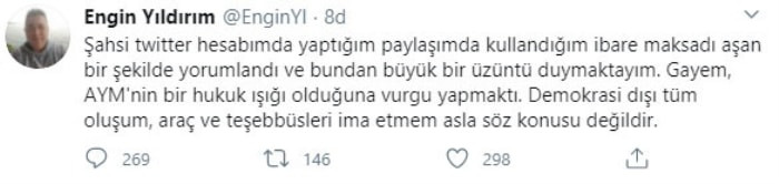 Peş peşe gelen tepkiler üzerine twitter hesabını korumaya alan Engin Yıldırım, gecenin üçüncü tweetiyle sözlerine açıklama getirdi. Yıldırım, paylaşımının maksadını aştığını ve darbe imasında bulunmadığını söyledi.