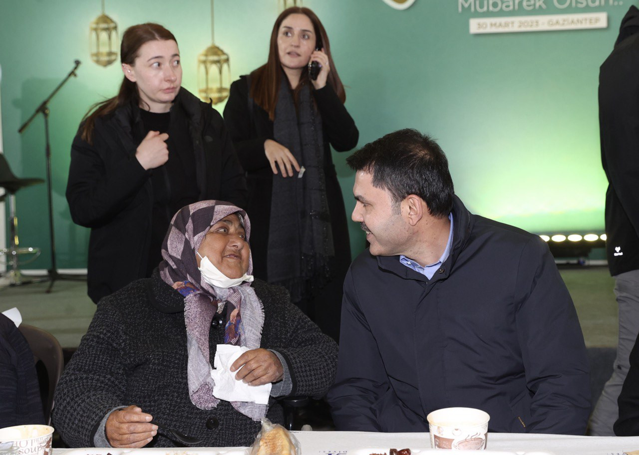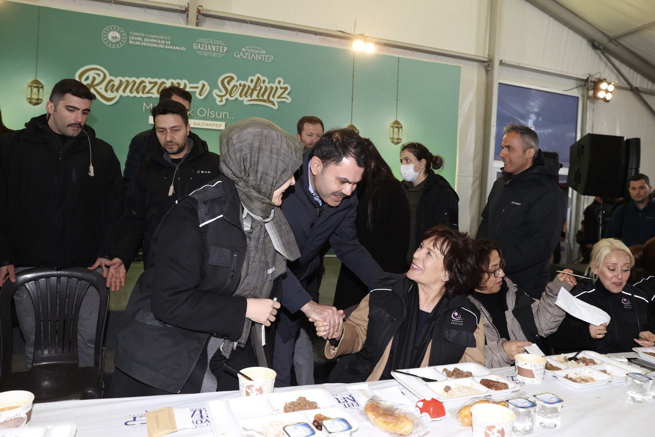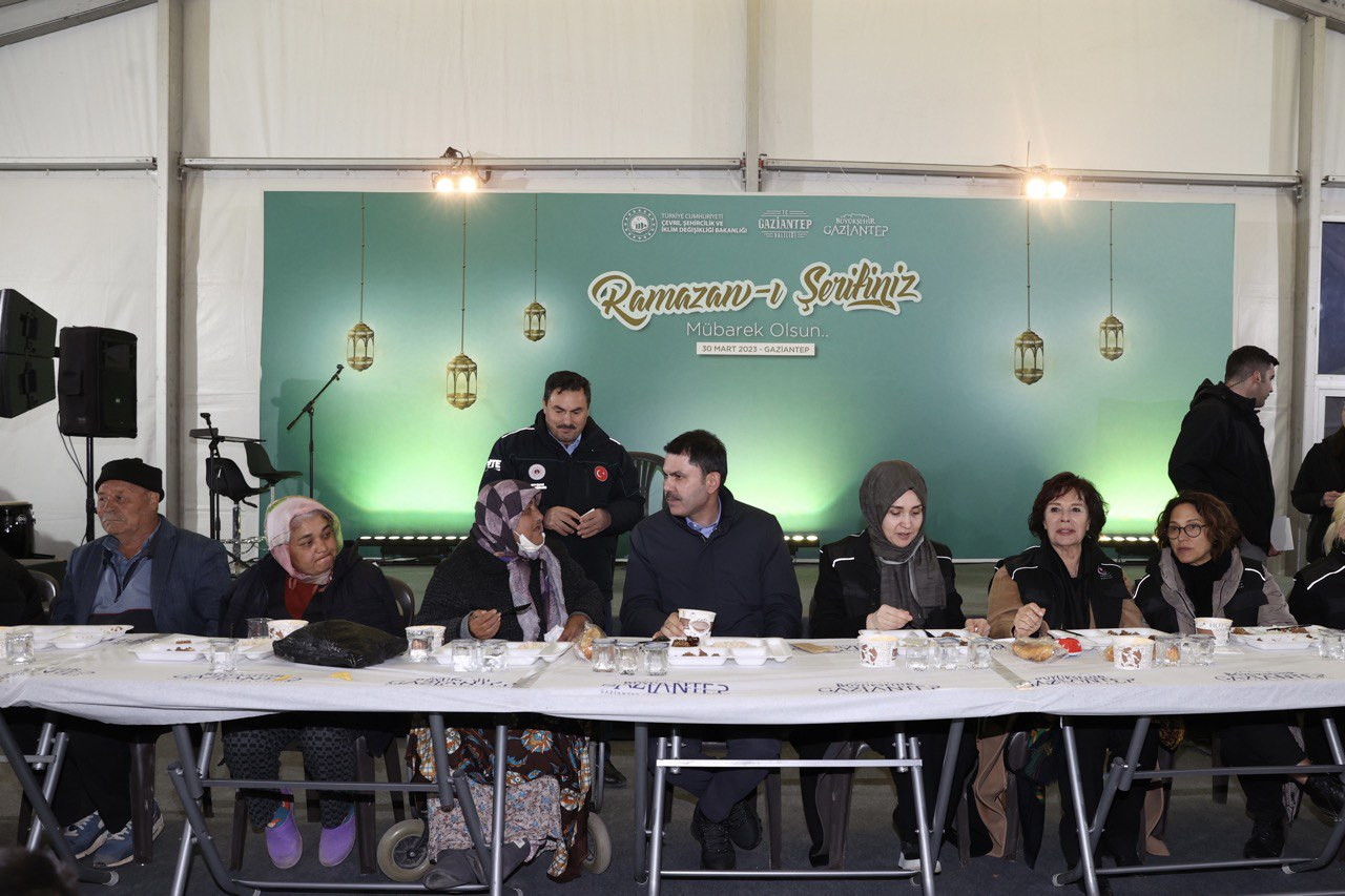 Çevre, Şehircilik ve İklim Değişikliği Bakanı Murat Kurum ve eşi Şengül Kurum’un katıldığı iftar organizasyonunda, ünlü sanatçı Hülya Koçyiğit de yer aldı. Ülkece zor günlerden geçildiğini belirterek sözlerine başlayan ve depremzede vatandaşlara Ramazan ayı münasebetiyle birlik, dirlik, kardeşlik ve bereket temennisinde bulunan Bakan Kurum, “İlk günlerden itibaren, tüm milletimiz 85 milyonluk büyük Türkiye ailesi; Gaziantep, Hatay, Adıyaman, İslahiye, Nurdağı, Kahramanmaraş ve Kilis’imiz için tek yürek oldular, seferber oldular. Bu asil millete tek yürek olmak yakışır. Bu asil millet zor günlerde hep bir, beraber ve kardeş olmuştur.” şeklinde konuştu.
