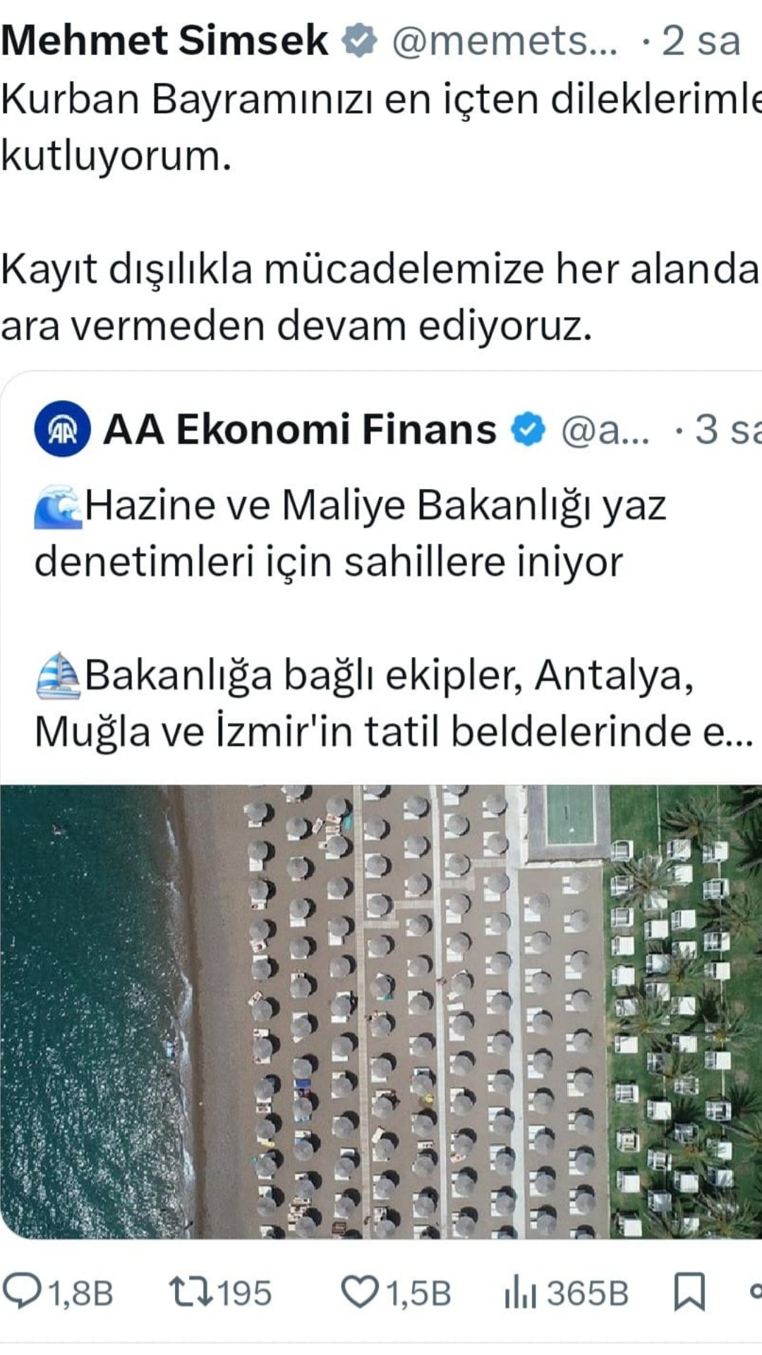 "Kurban Bayramınızı en içten dileklerimle kutluyorum. Kayıt dışılıkla mücadelemize her alanda ara vermeden devam ediyoruz."