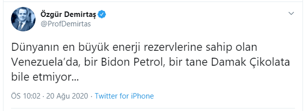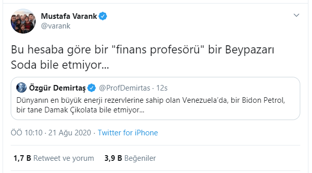 Kuru muhalefetiye bilinen Ekonomist Prof. Dr. Özgür Demirtaş da büyük tepki çeken bir mesaj yayınladı. Demirtaş, Venezuela’nın ekonomisi üzerinden örnek vererek sondaj çalışmalarını küçümsedi.