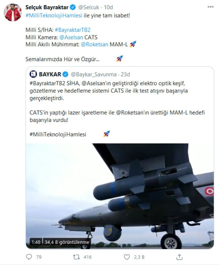 #MilliTeknolojiHamlesi hashtagini kullanarak sosyal medyadan açıklama yapan Baykar Teknik Müdürü ve T3 Vakfı Mütevelli Heyeti Başkanı Selçuk Bayraktar, "Yine tam isabet.. Milli S/İHA: Bayraktar TB2, Milli Kamera: ASELSAN CATS, Milli Akıllı Mühimmat: ROKETSAN MAM-L" ifadelerini kullandı.