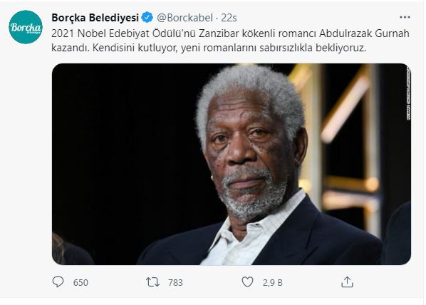 Borçka Belediyesi'nin resmi twitter hesabından yapılan paylaşımda, ünlü roman yazarı Abdulrazak Gurnah'ı tebrik ederken Morgan Freeman'ın fotoğrafının kullanılması sosyal medyada espri konusu oldu.