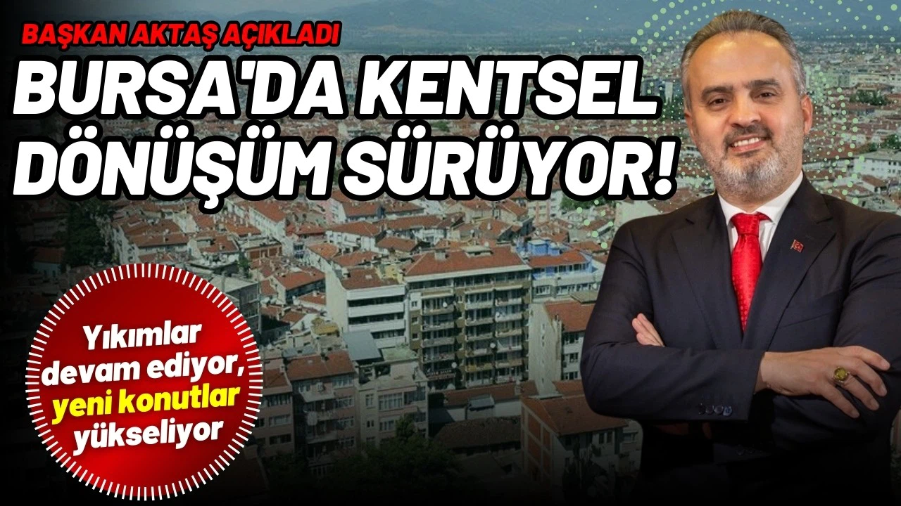 Bursa'da 14 bölgede kentsel dönüşüm sürüyor. Bursa Büyükşehir Belediye Başkanı Alinur Aktaş yaptığı açıklamada, 6 Şubat 2023'teki Kahramanmaraş merkezli depremlerde hayatını kaybedenlere Allah'tan rahmet diledi.