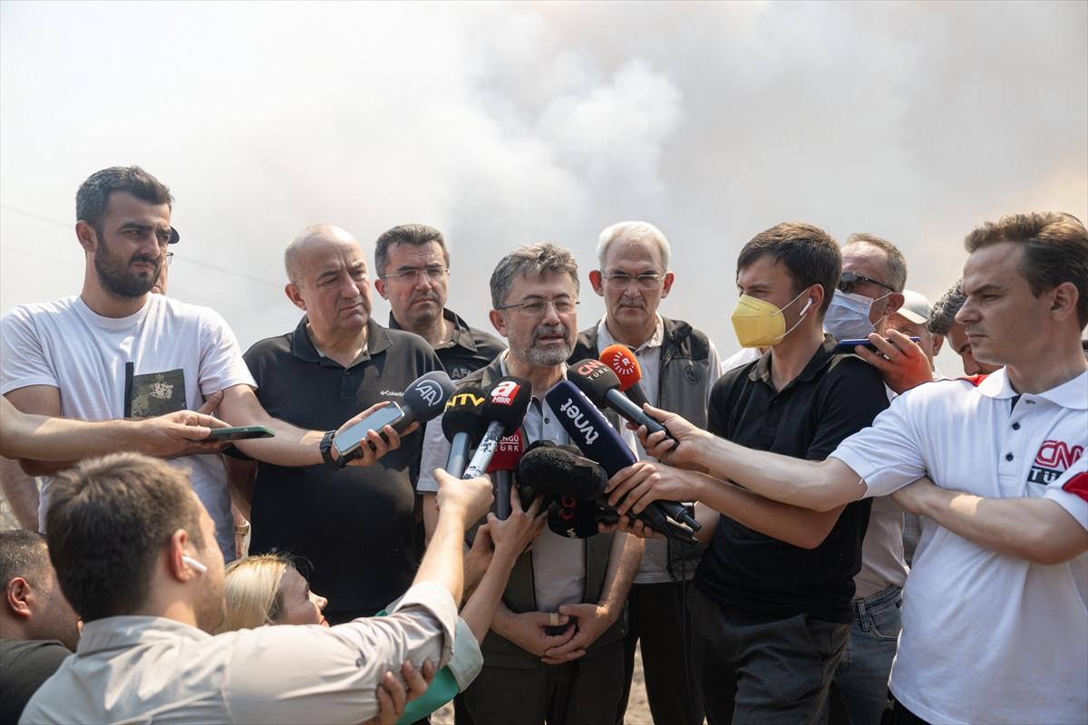 "Arkadaşlarımız burada yangınla alakalı faaliyetlerde bulunurken onların üzerinden yangın materyalleri, yanmış materyaller, rüzgarın hızıyla yanmamış alanlara gidebilir ancak şu anda onun için de gerekli tedbirleri almış durumdayız. Ümit ediyorum 1-2 saat içerisinde biz aynı sabahki söylediğim gibi burayla alakalı da gerçek resmi görmüş olacağız. Şu anda yoğun duman olduğu için biz arkadaşlarımızla haberleşerek, onların yukarıdan görmesi ve aynı zamanda bizim yangın mücadelemizde çok çok önemli olan insansız hava araçlarımızdan gelen bilgilerle biz durum tespitini yapıp arkadaşlarımızın yönlendirmelerini de onlardan almış olduk."