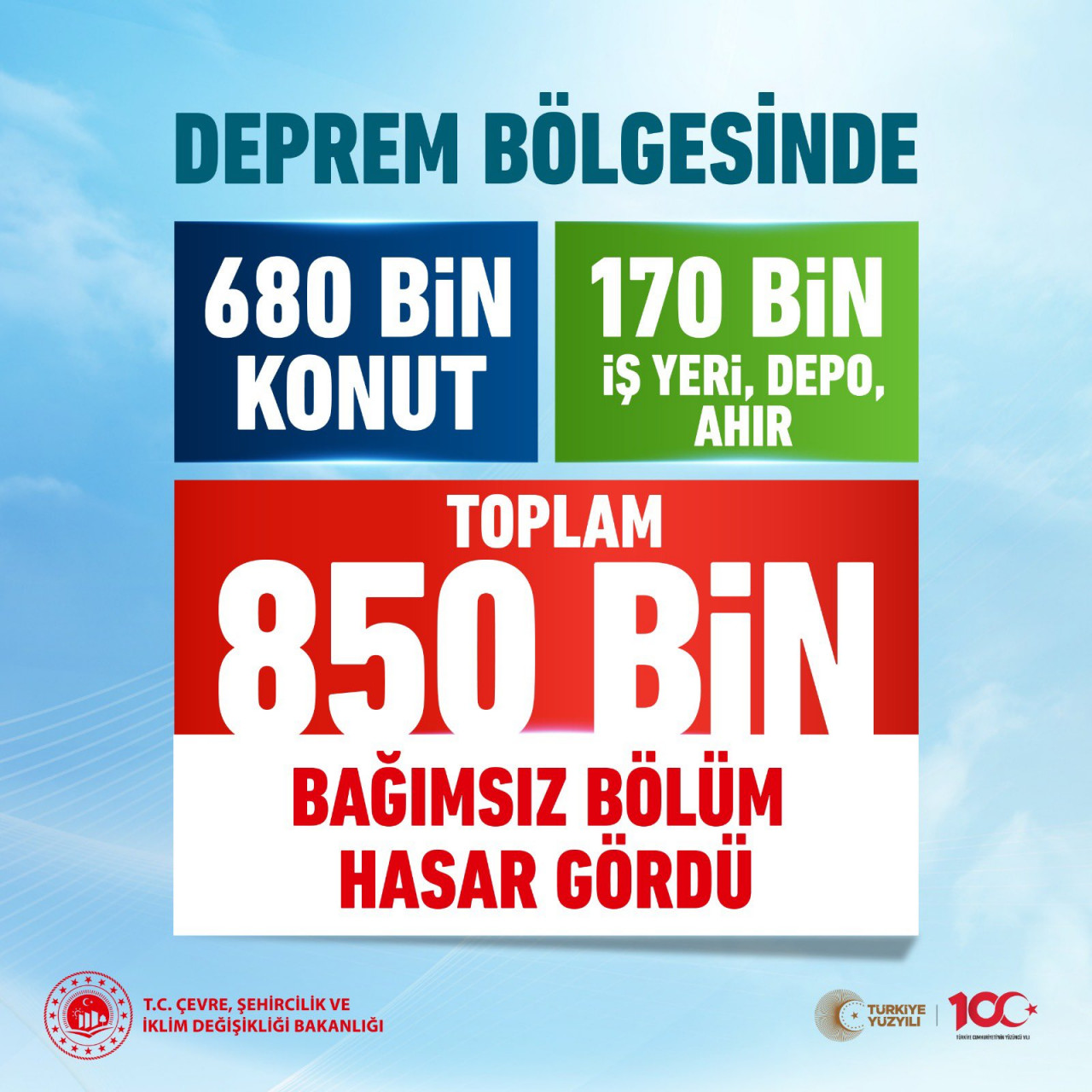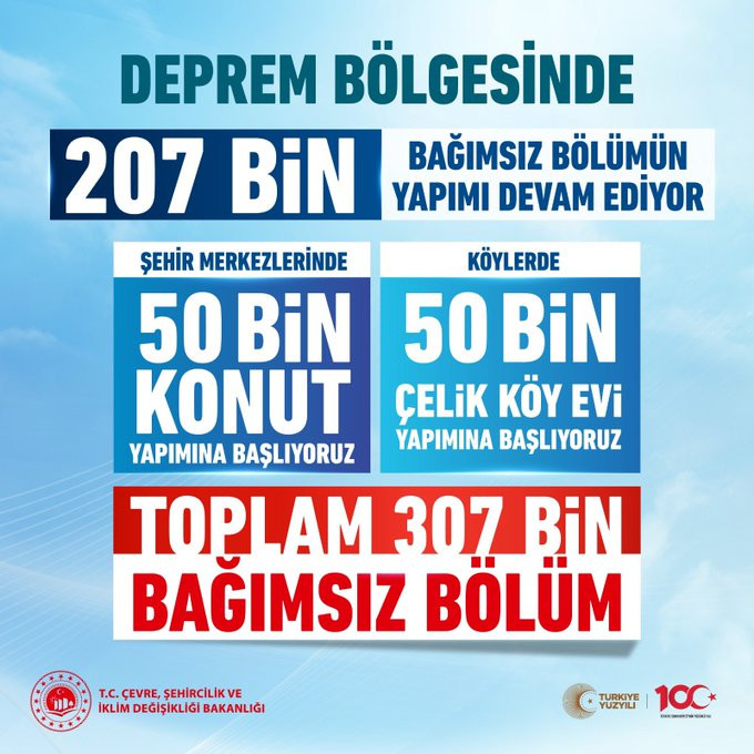 Deprem bölgesinde teslim edilen konutlar dışında, 207 bin bağımsız bölümün yapımına devam ediliyor. Şehir merkezlerinde 50 bin konut, köylerde ise 50 bin çelik köy evi olmak üzere yapımına başlanacak 100 bin bağımsız bölümle birlikte toplam 307 bin bağımsız bölümün inşası ise kısa süre içinde başlayacak.
