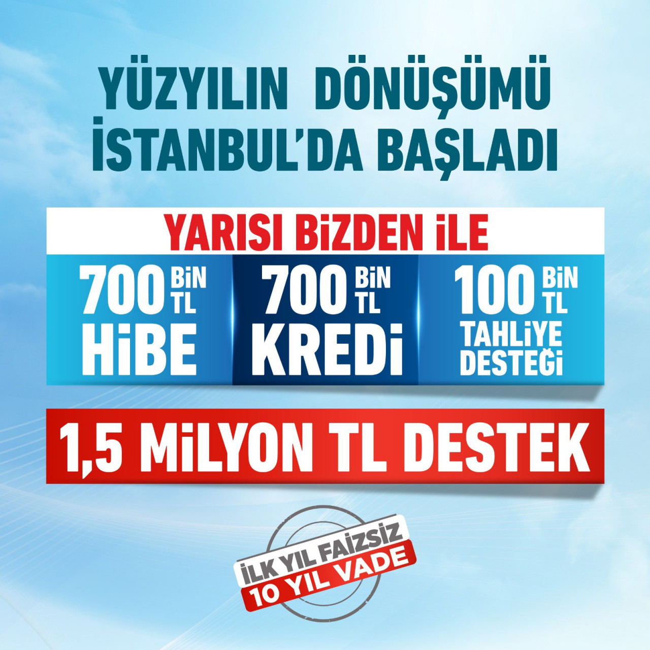 600 bin riskli konutun bulunduğu İstanbul'da kentsel dönüşüm çalışmalarına hız veren bakanlık, açıkladığı "Yarısı Bizden" kampanyası ile vatandaşlara, 700 bin TL hibe, 700 bin TL kredi ve 100 bin TL tahliye desteği olmak üzere toplam 1,5 milyon TL'lik destek paketini devreye soktu.