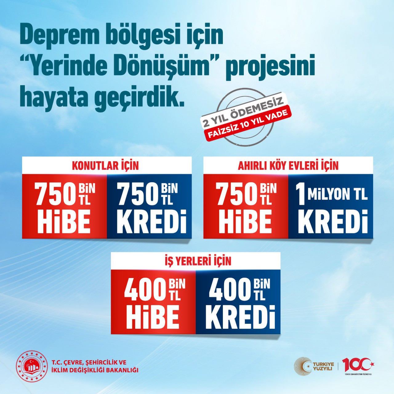 Deprem bölgesi için başlatılan Yerinde Dönüşüm projesi ile vatandaşlara konutlar için 750 bin TL hibe ve 750 bin TL kredi imkanı sunuldu. 2 yıl ödemesiz ve faizsiz şekilde 10 yıl vadeye bölünen krediler sayesinde vatandaşa kolay ödeme imkanı sunuldu. Yerinde Dönüşüm projesine şu ana kadar toplam 252 bin başvuru yapıldı.