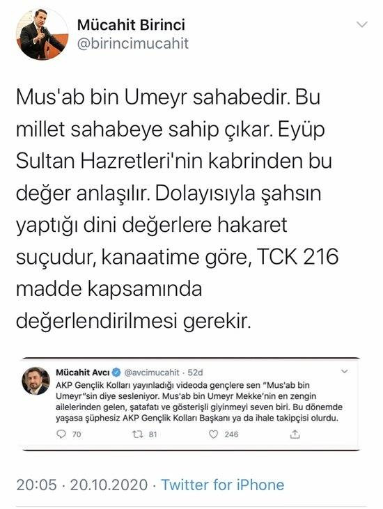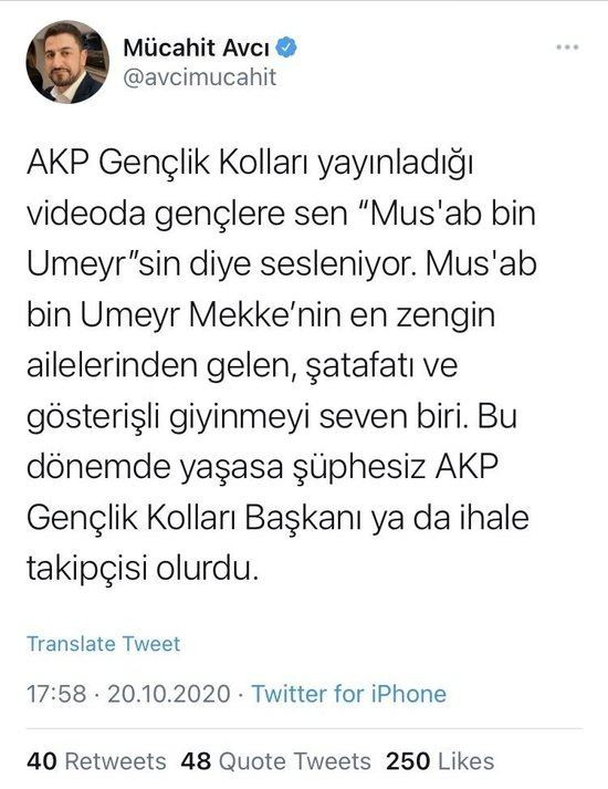 Mücahit Avcı; sosyal paylaşım sitesi Twitter'daki resmi hesabından yaptığı paylaşımda; "Mus'ab bin Umery bu dönemde yaşasa şüphesiz AK Parti Gençlik Kolları ya da ihale takipçisi olurdu" iddiasında bulundu.