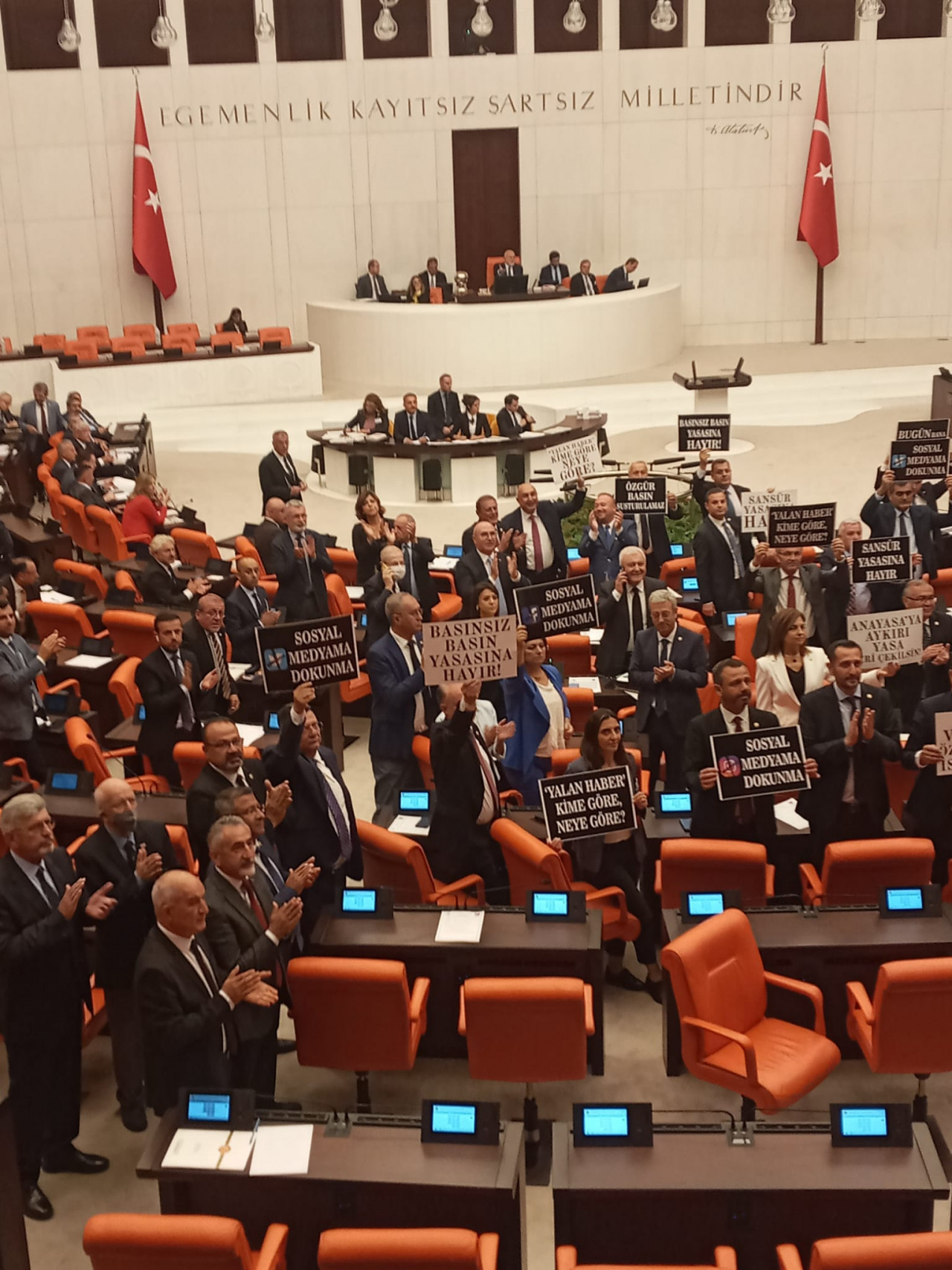 Ellerindeki dövizle genel kurula giren CHP'liler gündem dışı konuşmalar yapılırken hep birlikte ayağa kalkıp ellerindeki dövizi havaya kaldırarak "Sansür yasasına hayır" diye slogan attılar.