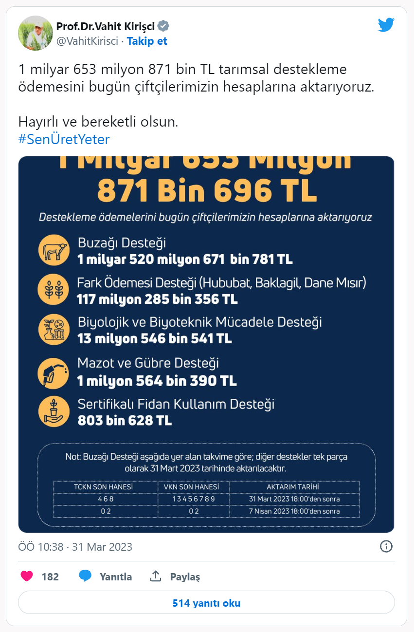 Tarım Bakanı Kirişci, Twitter üzerinden tarımsal destek ödemelerine ilişkin bir mesaj paylaştı. Tarım ve Orman Bakanı Vahit Kirişci, "1 milyar 653 milyon 871 bin TL tarımsal destekleme ödemesini bugün çiftçilerimizin hesaplarına aktarıyoruz. Hayırlı ve bereketli olsun." dedi.