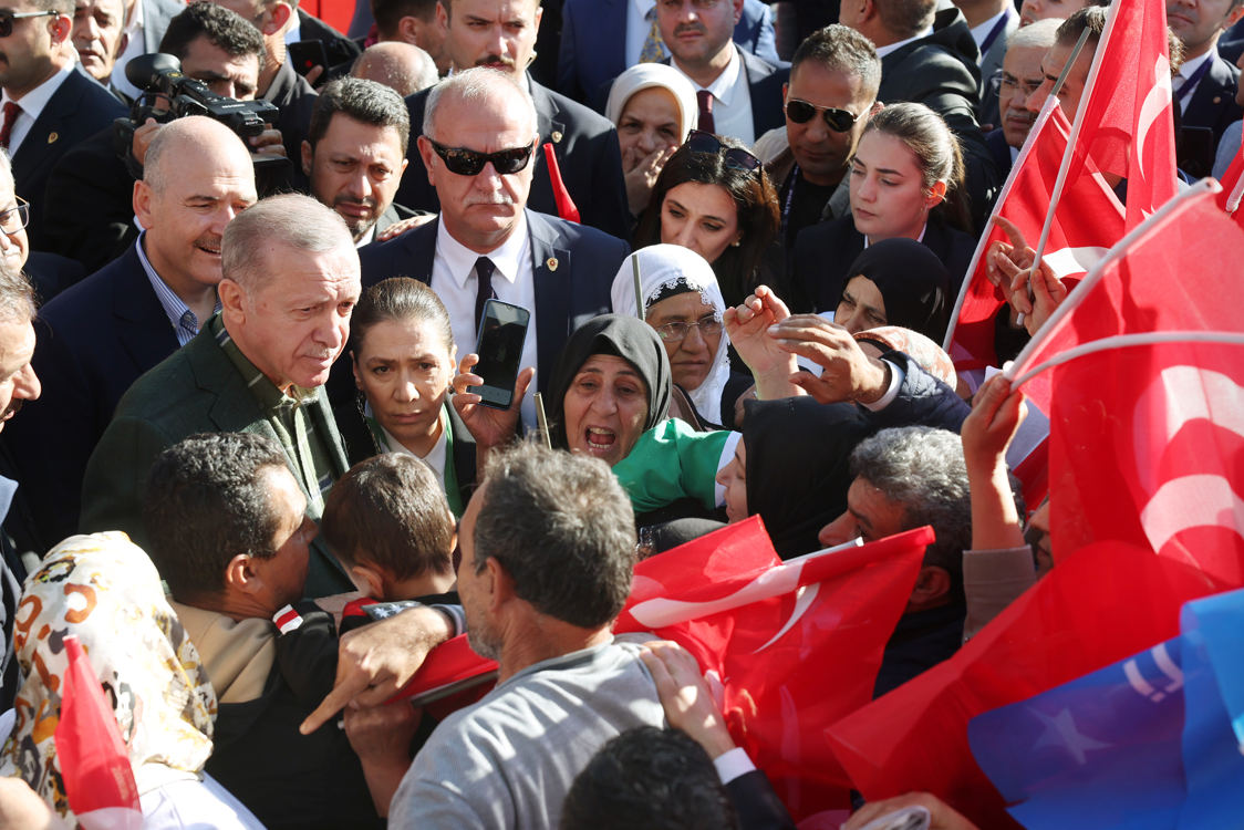 Erdoğan, İstasyon Meydanı'nda düzenlenen, "Diyarbakır Çevre Yolu, TOKİ 1525 Konut, 17 İşyeri, 1 Cami ve Büyükşehir Yatırımları ile Yapımı Tamamlanan Diğer Projelerin Toplu Açılış Töreni"ndeki konuşması öncesinde, alanda bulunan Diyarbakır anneleriyle görüştü.