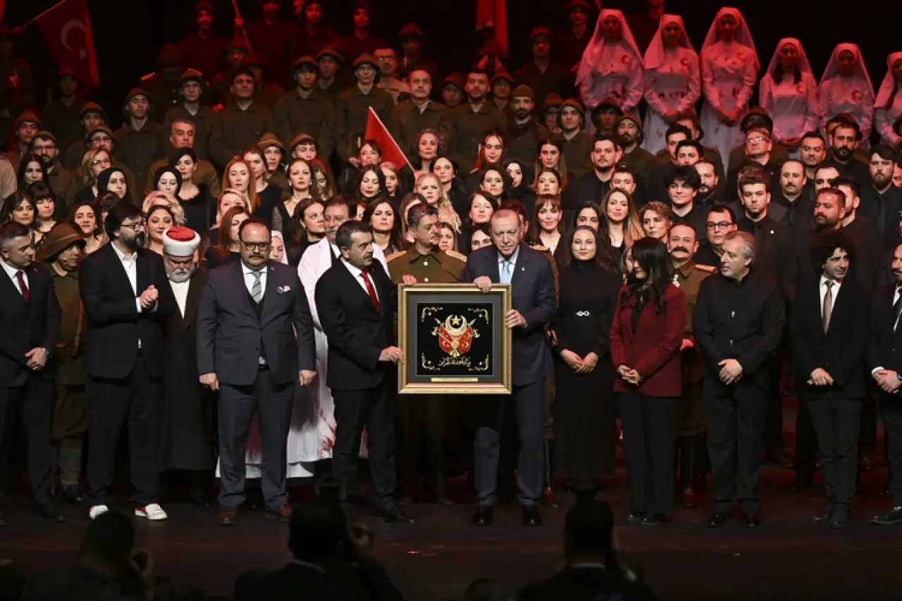 Cumhurbaşkanı Recep Tayyip Erdoğan, Çanakkale Deniz Zaferi'nin 111'inci yıl dönümü dolayısıyla hazırlanan "Şüheda 1915" tiyatro gösterimini Beştepe Millet Kongre Merkezi'nde izledi.