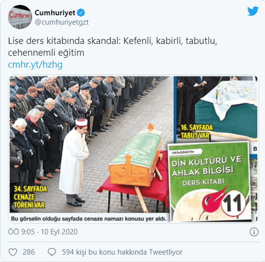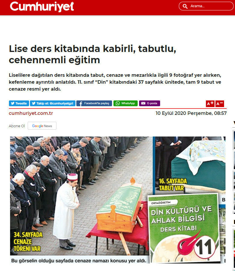 11. sınıf öğrencilerine dağıtılan kitapta din kültürü dersin müfradatına uygun olarak verilen bilgiler Cumhuriyet gazetesinde "Lise ders kitabında kabirli, tabutlu, cehennemli eğitim" manşetiyle servis edilirken, Sözcü gazetesi ise haberi "Kefenli, kabirli, tabutlu, cehennemli eğitim" manşetiyle verdi.