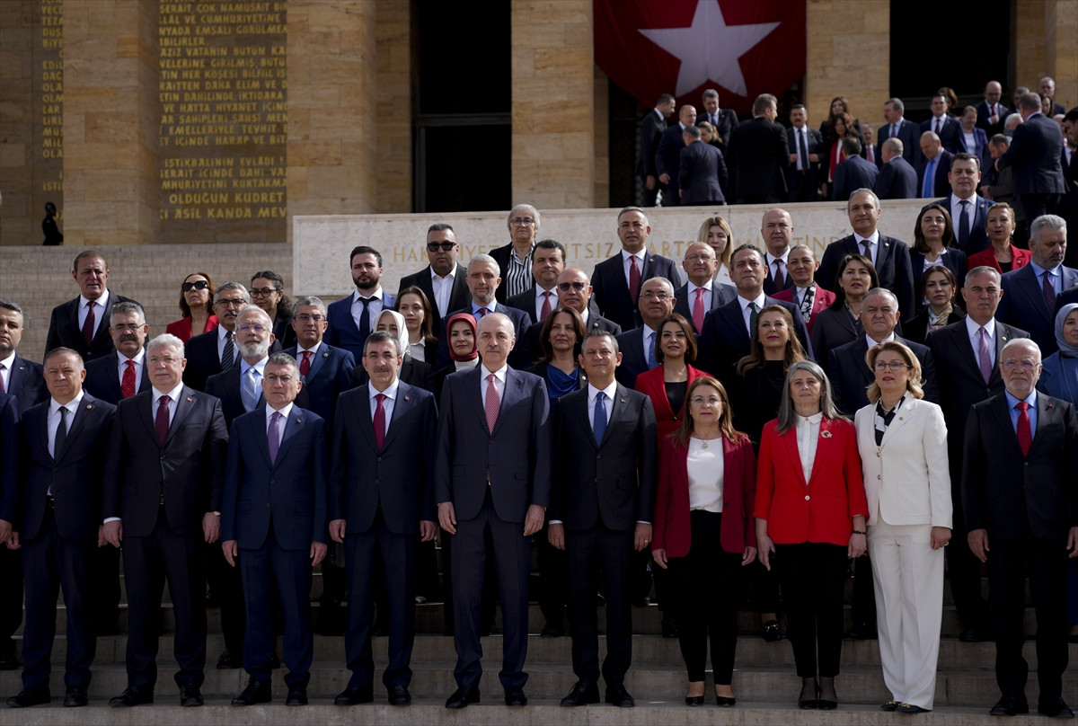Aslanlı Yol'dan yürüyerek Gazi Mustafa Kemal Atatürk'ün mozolesine gelen heyet, TBMM Başkanı Kurtulmuş'un mozoleye çelenk bırakmasının ardından saygı duruşunda bulundu ve İstiklal Marşı'nı okudu.