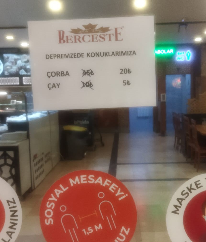 Tüm Türkiye'nin afet bölgesindeki depremzedeler için seferber olduğu günlerde durumdan vazife çıkarmaya çalışan Berceste isimli bir işletme, "depremzedelere özel" olarak normal zamanda 45 liraya sattığını iddia ettiği çorbayı 20, 10 liraya sattığını iddia ettiği çayı ise 5 TL'ye indirdiğini duyurdu.
